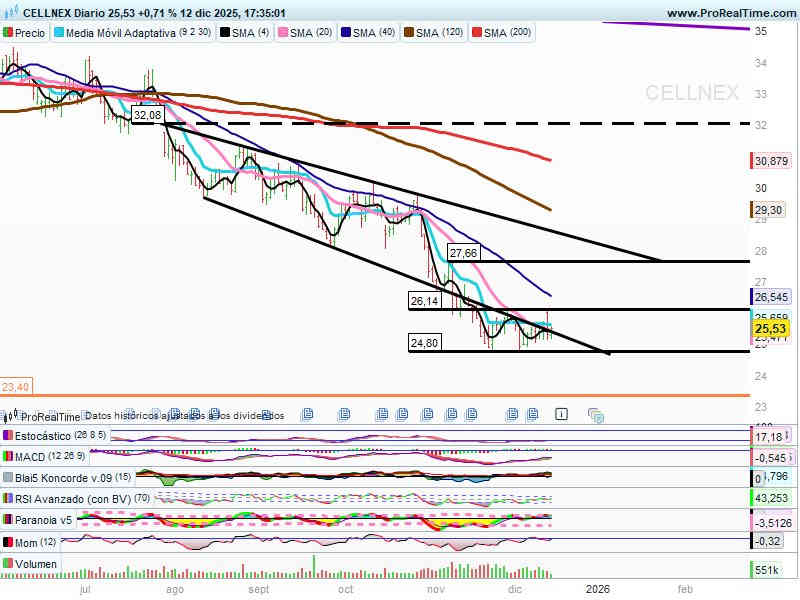 Velas diarias. Mantiene la zona de soporte situada aproximadamente sobre los 26€ y dentro del canal bajista de c/p.