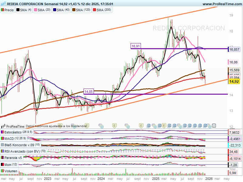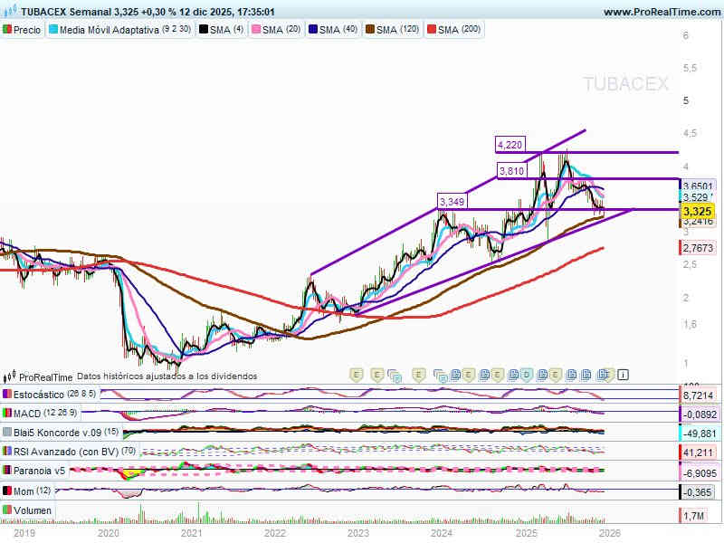 Sin descartar realizar nuevamente visita a la directriz alcista de l/p, por donde pasa la SMA 120 sesiones. Clave no perder los 3,20€.