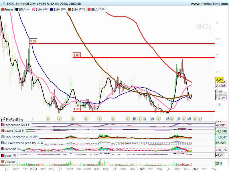 Velas semanales. El valor consigue recuperar valores de la SMA 120 y 40 sesiones que pasan aproximadamente en torno a 1,80€ y logra alcanzar la SMA200 sobre 2,20€.