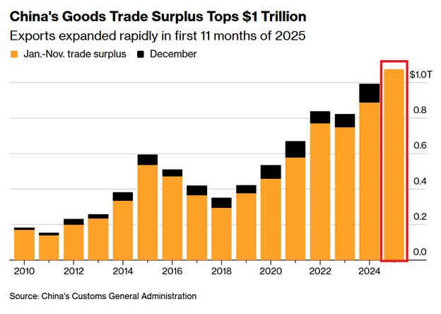 El superávit comercial total de bienes de China ha aumentado un +21% interanual, alcanzando un récord de 1,1 billones de dólares en los primeros 11 meses de 2025, casi triplicando el superávit comercial de 2019.