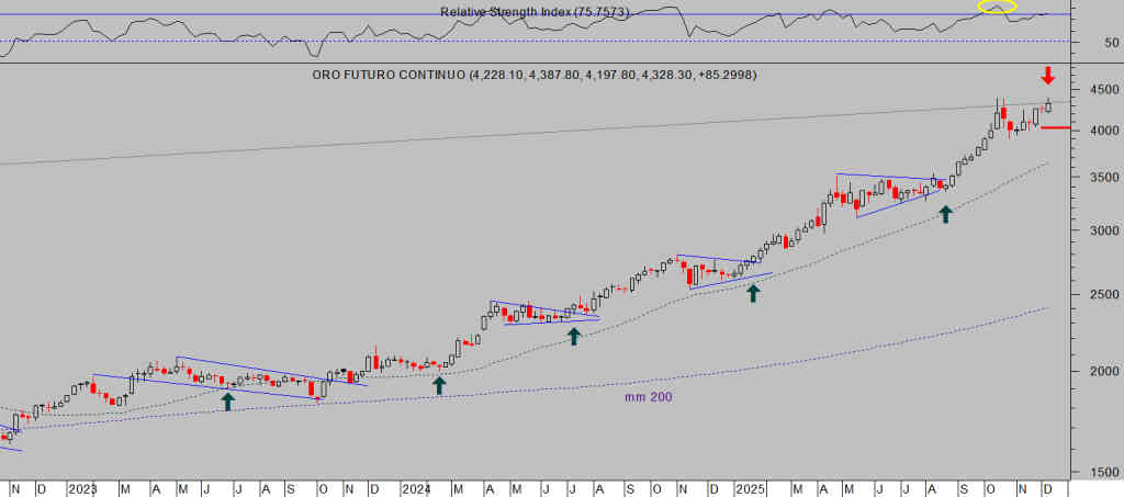 La zona de los $4.400 por onza detuvo el rally a mediados del pasado mes de octubre y desde entonces el precio viene desplegando un movimiento lateral que ya suma 7 semanas y ha permitido relajar ligeramente las lecturas de sobrecompra extremas alcanzadas entonces.