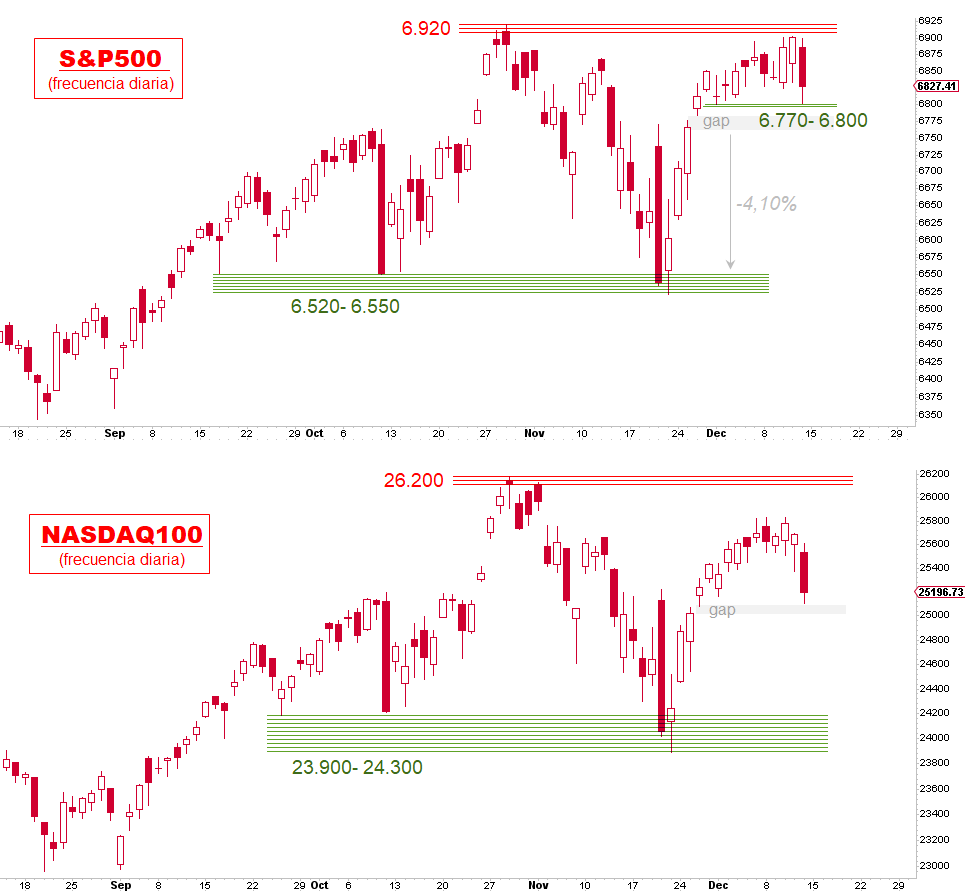 Los mínimos del pasado viernes en el SP500, en la zona de 6770- 6800 puntos, se considerarían un primer nivel de soporte de corto plazo (mínimos de las últimas diez sesiones), precediendo al más importante de plazo en los mínimos de finales de noviembre, entre 6520 – 6550 puntos.