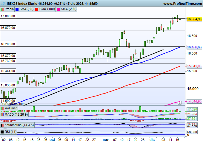 El Ibex35 sigue bloqueado en la zona de los 17.000 puntos, donde cada intento de superar el nivel encuentra presión vendedora que provoca reacciones a la baja. Este bloqueo mantiene a los inversores indecisos sobre si el índice logrará batir definitivamente esa zona.