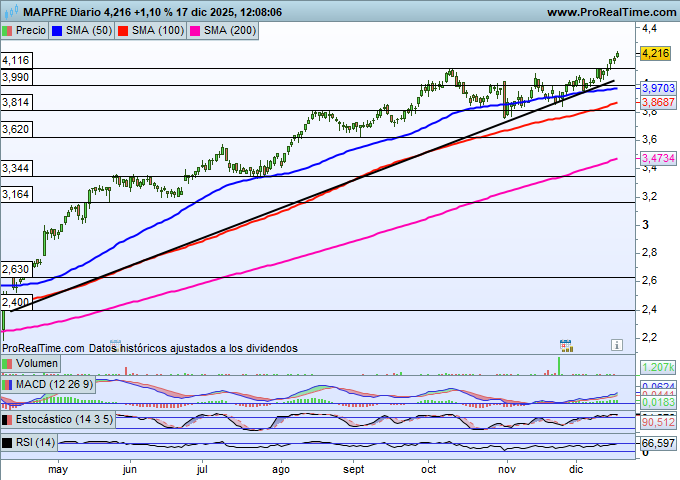 Otro de los sectores en el que estamos viendo cierta rotación de dinero es el asegurador, y en este contexto MAPFRE (MAP:MC) se presenta como uno de los valores del Ibex35 que se encuentra en máximos históricos y que podría tener todavía recorrido al alza. A los numerosos aumentos de valoración y de precio objetivo de la compañía se suma un análisis técnico favorable que respalda nuevos avances. Durante 2025, la consecución de mínimos y máximos crecientes ha impulsado el precio de sus acciones en más del 84%.