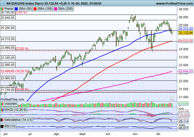 En el caso del NASDAQ-100, el índice tecnológico ha experimentado un nuevo rechazo en la zona de los 25.840 puntos antes de intentar acercarse a sus máximos históricos. Los bajistas han tomado el control y, a pesar de repuntes puntuales como el registrado en la sesión de ayer, la media móvil de corto plazo ha cedido, limitando las expectativas de avances claros en los próximos días.