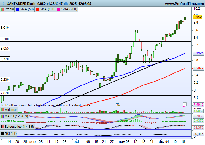 En el muy corto plazo, Banco Santander ha superado la resistencia de los 9,60 euros por acción, lo que ha dado paso a un nuevo tramo alcista con un primer objetivo en la zona de los 10 euros por título. En ese nivel se ha apreciado un cierto tapón durante los últimos días, por lo que será vital que el valor logre superarlo en dos sesiones consecutivas o en un cierre semanal por encima para mantener las perspectivas alcistas.