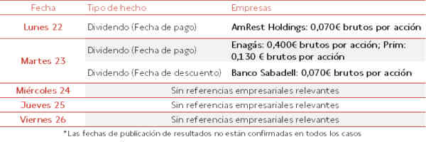 En el ámbito empresarial, destacará el pago de dividendos de Enagás, Prim y AmRest Holdings, entre otros.