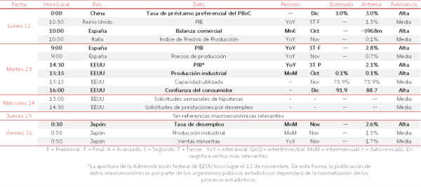Entre las referencias macroeconómicas protagonistas de la próxima semana en la región Asia-Pacífico destacarán en China la decisión de tipos de interés de préstamo preferencial del PBoC en un contexto de ralentización del consumo interno, a pesar del avance significativo de las exportaciones en noviembre. Por su parte, en Japón será relevante la evolución de la tasa de desempleo (vs. 2,6% de la población activa en octubre), de la producción industrial (vs. 1,5% mensual en octubre) y de las ventas minoristas en el mes de noviembre (vs. 1,7% interanual en octubre).