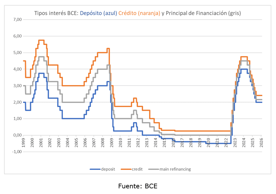 Los tipos oficiales europeos quedan en el 2% y se mantienen también inalterados sin cambios los tipos de facilidad marginal de depósito y de crédito.