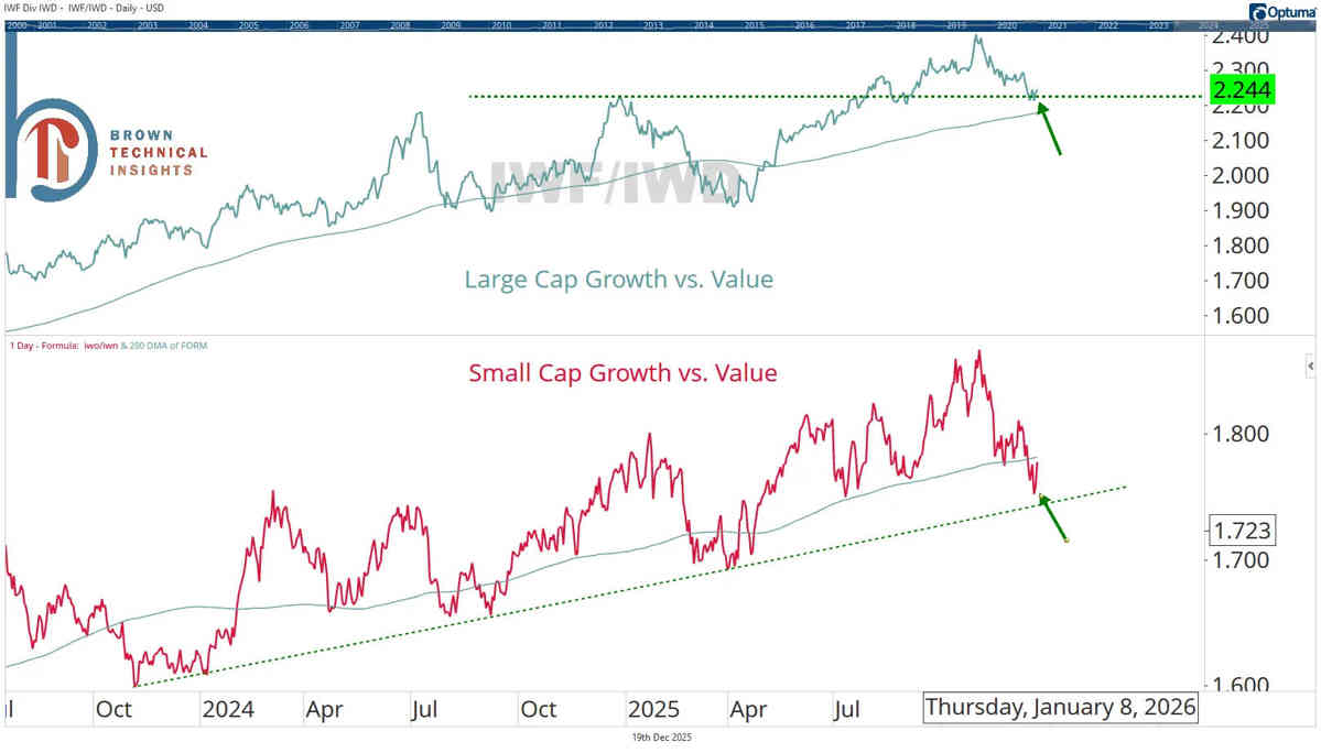 Scott señala que ambas relaciones Crecimiento/Valor están probando un soporte potencial, y este puede ser un punto lógico para que Crecimiento reafirme su liderazgo.