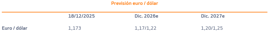 La combinación de estos factores hará que la tendencia de depreciación continúe a lo largo de 2026, aunque algo más moderada que en 2025. Nuestras previsiones consideran un rango para el Euro/Dólar de 1,17/1,22 en diciembre de 2026 y 1,20/1,25 para 2027.
