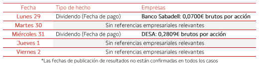 En el ámbito empresarial, destacará el pago de dividendos de Sabadell y DESA.