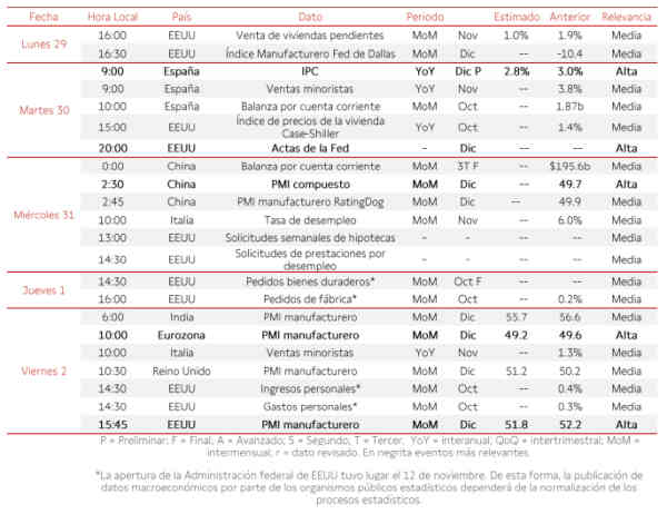 Respecto a los datos publicados por instituciones privadas y otros organismos, el lunes 29 la atención se situará en la evolución de las ventas de viviendas pendientes en el mes de noviembre, tras repuntar un 1,9% mensual en el mes anterior, y en el índice manufacturero de la Fed de Dallas de diciembre (vs. -10,4 puntos noviembre). Al día siguiente destacarán el índice de precios de la vivienda Case-Shiller de octubre (vs. 1,4% interanual en septiembre) y las actas de la reunión de diciembre de la Fed. El miércoles 31 destacará las solicitudes semanales de hipotecas y el viernes 2 de enero la atención se centrará en la evolución del indicador adelantado PMI del sector manufacturero en diciembre, tras disminuir 0,4 puntos hasta 52,2 puntos en noviembre.