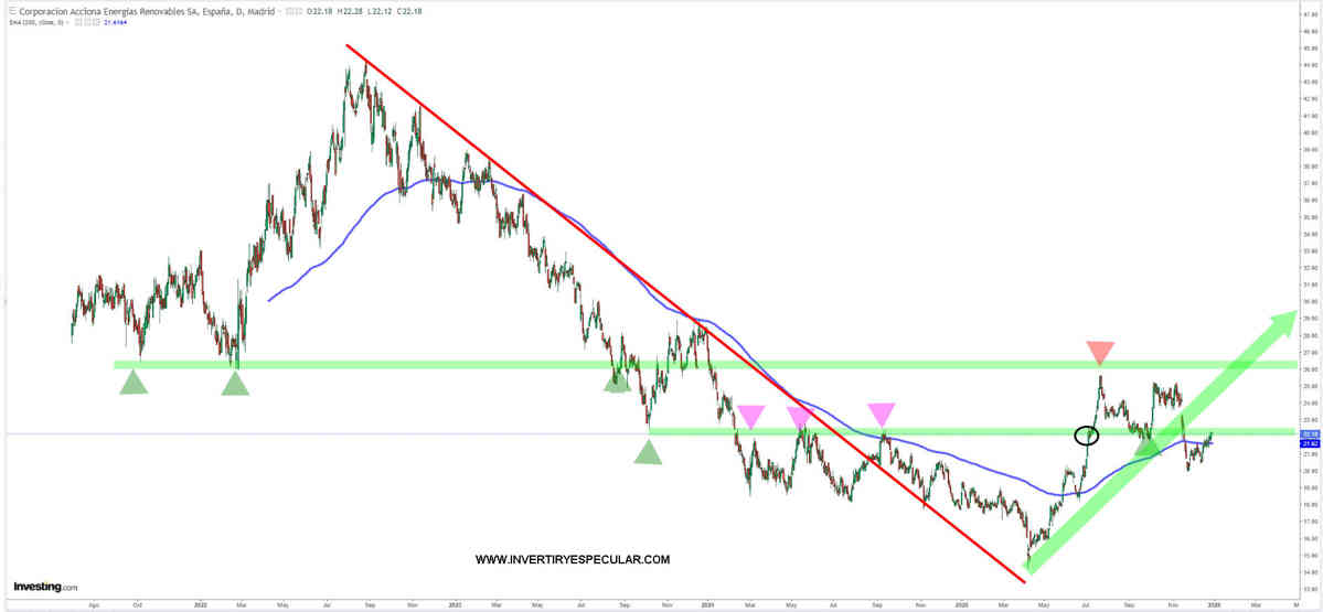 ACCIONA ENERGIA pues otra «peor que mercado» o dicho por pasiva el IBEX dobla a esta acción en rentabilidad este año. Nos ilusionó mucho cuando superaba la zona 22 euros en verano porque era una línea polar importante y la confirmación de un suelo, pero fue intentar terminar el pullback a 26 euros y darle colitis, perdió la fuerza e incluso perdió la EMA 200 que ahora trata de recuperar junto con los 22 euros. MANTENER y COMPRA a cierre sobre 22 euros de nuevo porque claro si ya hizo el pullback si vuelve a subir es para lograr una recuperación mayor en buena lid.