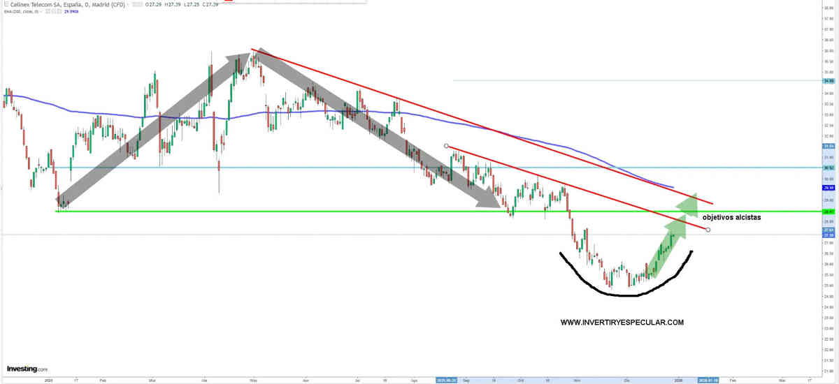 Ahora bien su pinta técnica es de haber hecho suelo este año y nos parece que ya inició una vuelta alcista al menos y como mínimo para digamos un pulback a los 28,5 euros y la bajista de este año que se está viendo reforzada por el paso de la EMA 200, si puede con estas referencias el próximo año dará señal de compra clara. Pero por el momento tildamos su comportamiento gráfico de rebote técnico. A estos precios MANTENER.