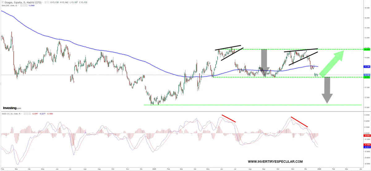 ENAGAS ya venía mal, no da plusvalías reales desde el 2015 solo dividendos anuales contantes y sonantes, año mediocre con un IBEX absolutamente desbordante que se lo hace más decepcionante a sus inversores, aunque este año lo cierra positivo (11.5%) desde la primavera lleva en lateral en rango 13-14.4 euros pero ojo, sin ajuste de dividendos con ellos no estaría en soporte del mismo en este momento, y con la gráfica ajustada a dividendo tampoco estaría tan bajista la acción, más bien lateraloide, pero mantenemos que lo único que da son dividendos no plusvalías en esta última década completa.