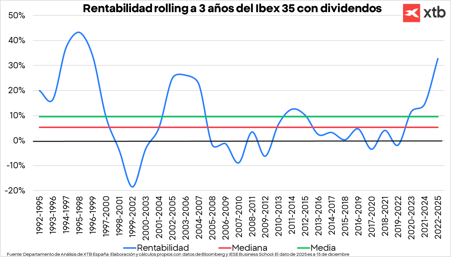 Si observamos los periodos de 3 años desde el 1992, también podemos ver cómo el selectivo español ha tenido una rentabilidad histórica. En concreto, el periodo de 2022-2025 ha sido el cuarto mejor periodo de 3 años de su historia, solo por detrás de los años 90, con una rentabilidad anualizada del 32,8% y superando al periodo del boom inmobiliario.