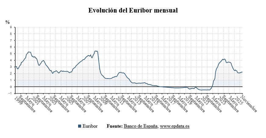 El euríbor sube por quinto mes en diciembre. En concreto, el euríbor a 12 meses del mes de diciembre de 2025 ha cerrado en 2,268%, frente al 2,217% del mes anterior y el 2,436% de diciembre de 2024.