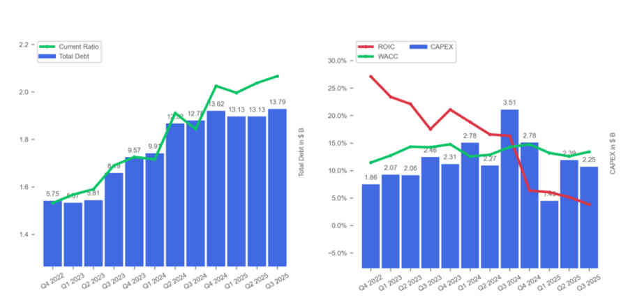 Además, su deuda está creciendo. Desde 2022, casi se ha duplicado, mientras que el ROIC ha caído de forma sostenida. Desde el tercer trimestre de 2024, de hecho, el ROIC está por debajo del WACC, lo que significa que Tesla genera un retorno sobre el capital invertido inferior al costo de ese capital, un factor que destruye valor para los accionistas.