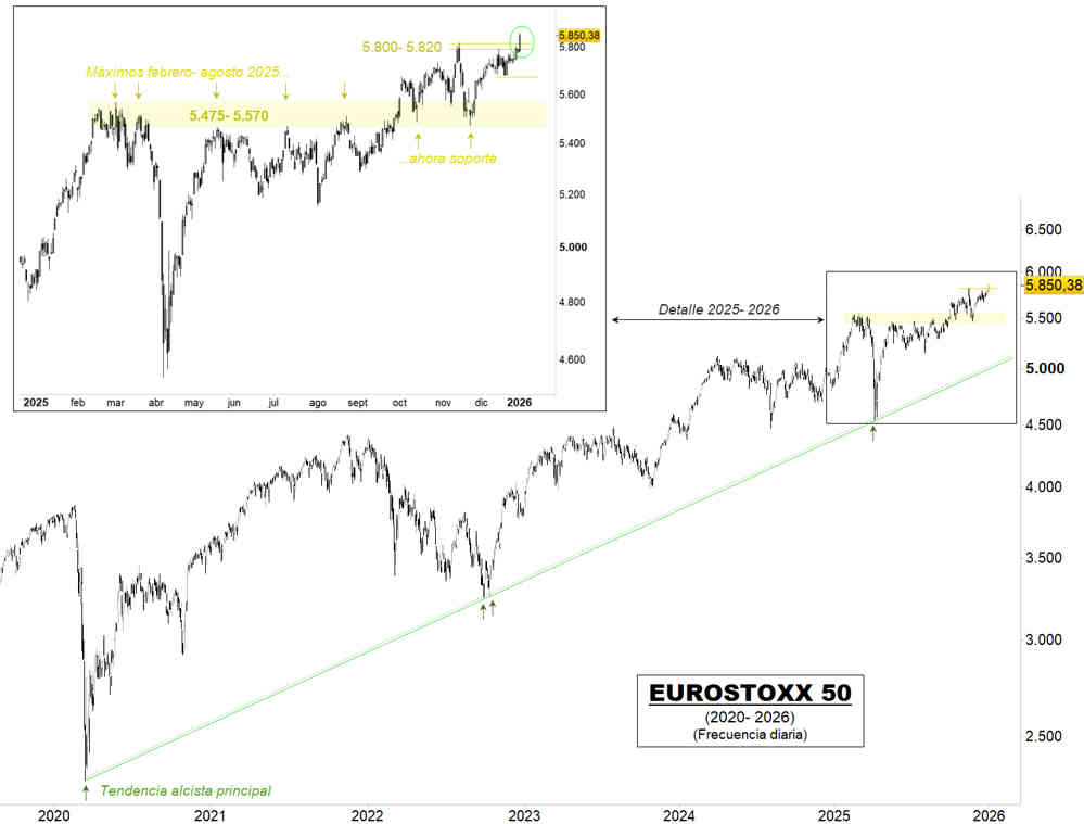 Esta tónica de continuidad alcista se aprecia mejor en el principal índice europeo, el EUROSTOXX 50, que superaba la semana pasada los máximos de mediados de noviembre, estableciendo en los mismos, entre 5800 y 5820 puntos, referencia inmediata de soporte.