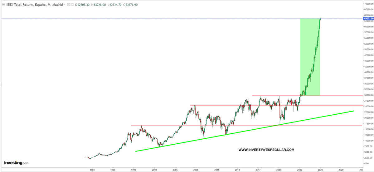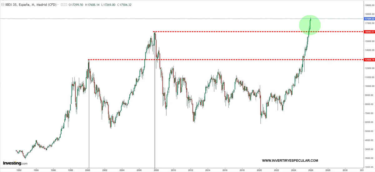 Hoy el IBEX35 se marca un nuevo máximos histórico en los 17650 puntos en gráfico lineal y estamos en el tercero del siglo, primero 2000, segundo 2007 y el tercero será donde muera el presente tramo iniciado en el suelo de marzo 2020.
