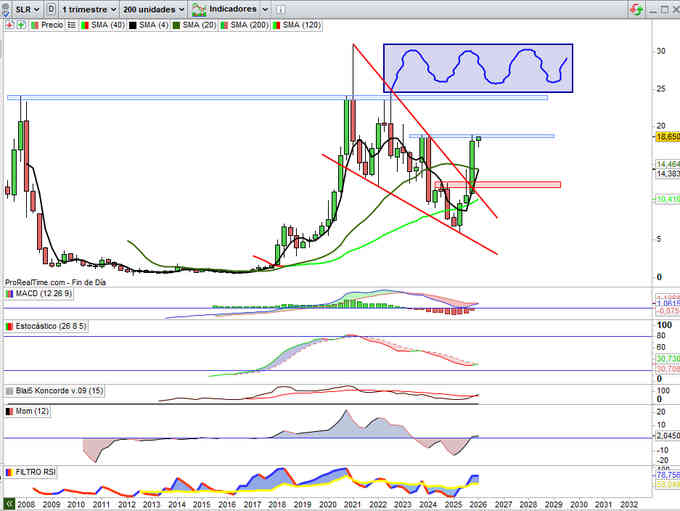 Sobre Gráfico Trimestral, recordando que la estructura de SOLARIA en credenciales técnico / fundamentales actuales y en escenario SHORTSQUEEZE el valor tiene activada también una señal muy alcista en despliegue de Tres Soldados Blancos, y en esta vista sería suficiente una perforación de la resistencia 18,61€ y confirmativos a partir de los 18,92€ para proyectar el activo hacia la siguiente cota resistencia de los 23,65€ / 31€. no sería extraño ver este valor en máximos históricos y nuevos máximos históricos como esta haciendo GRENERGY y ya referido en anteriores actualizaciones.