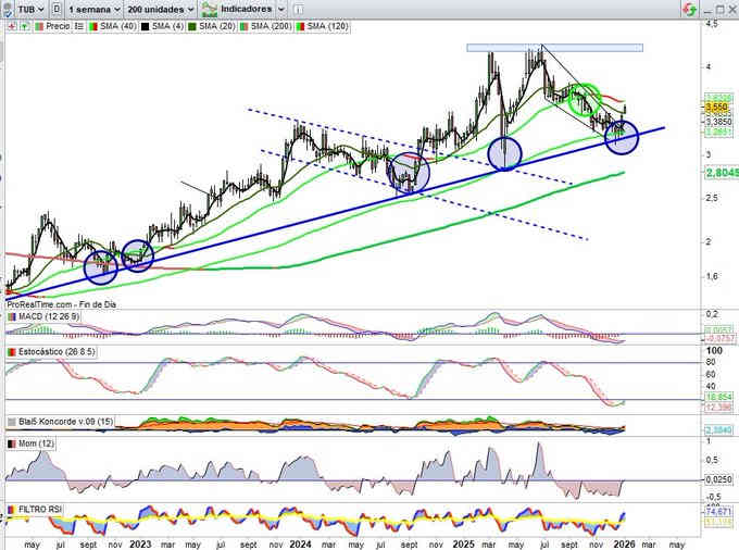 Perforando en estos momentos las referencias Medias Móviles 40 y la más importante, la 120, clave como soporte también de su estructura actual. Paciencia, paso a paso.