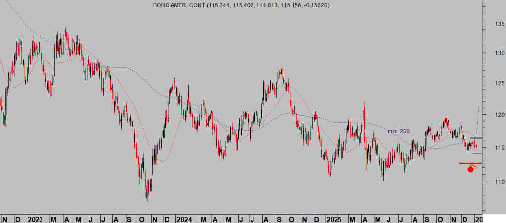 Los bonos sin embargo abren el año como cerraron el anterior, sin tendencia y con los precios merodeando su importante referencia técnica representada por el media móvil de 200 sesiones desde hace un mes, el riesgo geopolítico así como la vuelta del Tesoro a las emisiones de papel están frenando los intentos de subida.