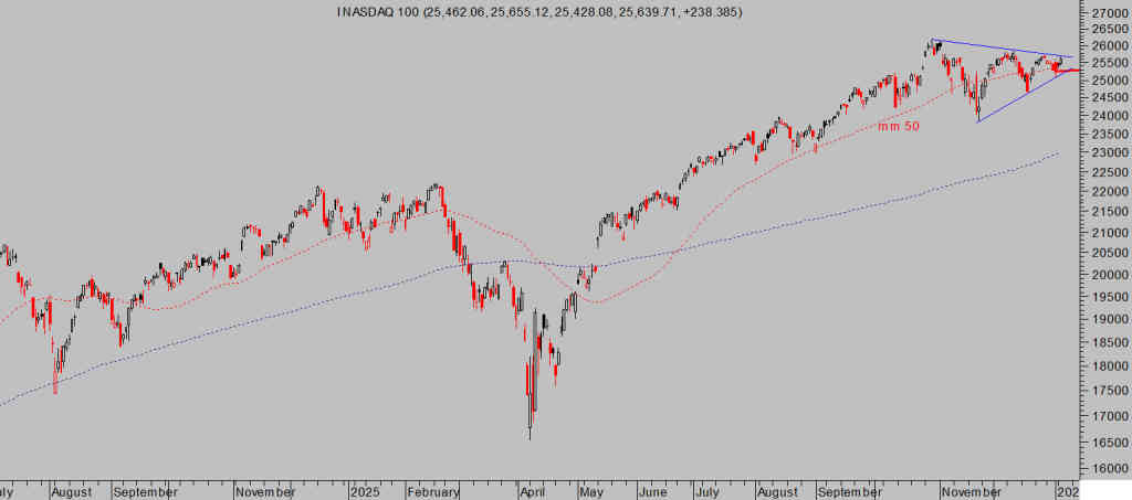 El Nasdaq de momento sigue cotizando por debajo de sus máximos alcanzados a finales del mes de octubre, cotizando muy cerca de la zona de resistencia representada por la formación triangular que se viene desarrollando desde octubre y que rebasada con éxito sí abriría camino para la conquista de niveles record.