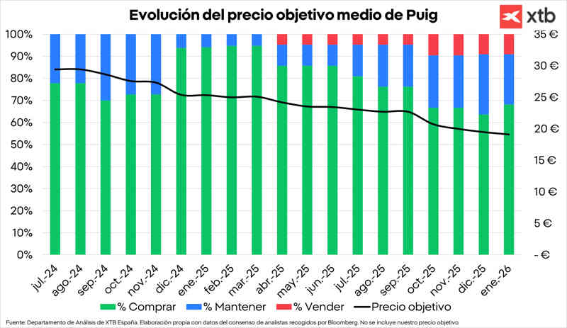 Con una mirada algo más amplia, vemos como casi el 70% de los analistas que recoge el consenso de Bloomberg le otorgan a las acciones de Puig una recomendación de compra, mientras que a principios del 2025 era de más del 90% y no tenía ninguna recomendación de venta.