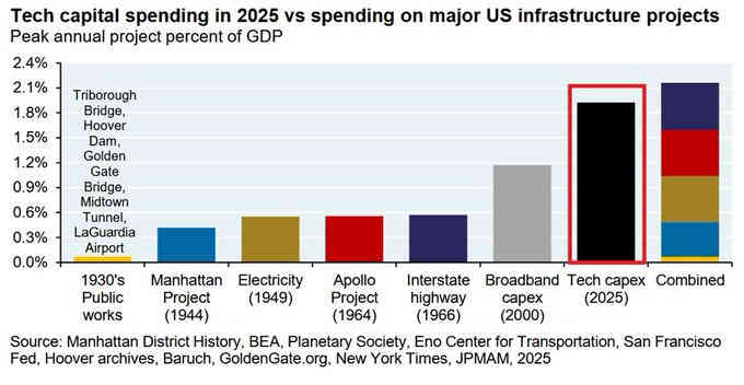 La Inteligencia Artificial acapara gran parte del pastel de las inversiones. En 2025 el CapEx tomado en porcentaje del PIB casi igualó la escala combinada de los mayores proyectos de capital del siglo XX, alcanzando aproximadamente el 1.9% del PIB.