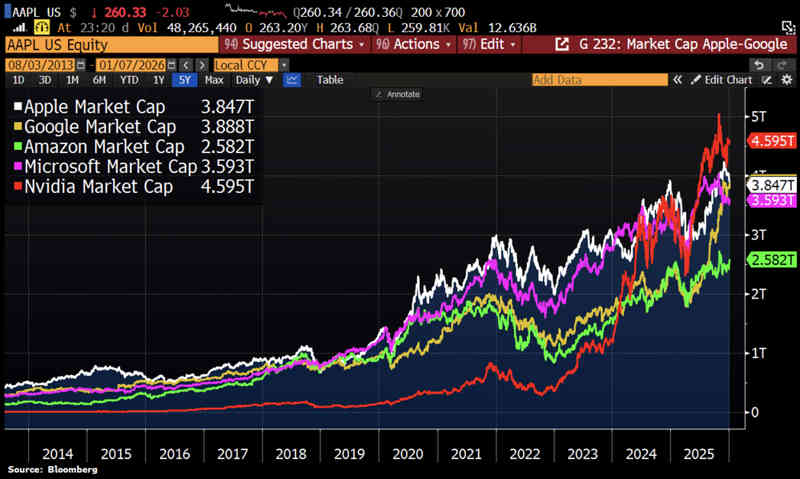 Lo que si se puede afirmar con certeza es que las empresas tecnológicas y más involucradas en la revolución IA han disparado sus cotizaciones, sus valoraciones y capitalización espectacularmente, sólo las 5 granes suman una capitalización conjunta de $18.45 billones.