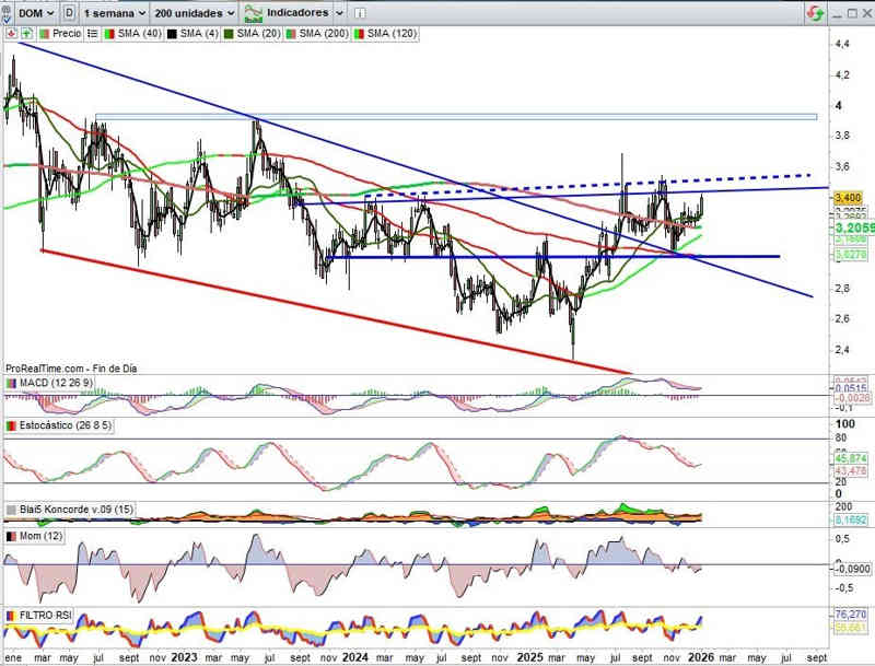 3,40€, +2,87% esta semana. Otro pasito adelante para el intento de superación de la resistencia clave en estos momentos. Es importantísima porque daría paso en su perforación a la proyección de alto potencial hacia la zona de los 3,95€.
