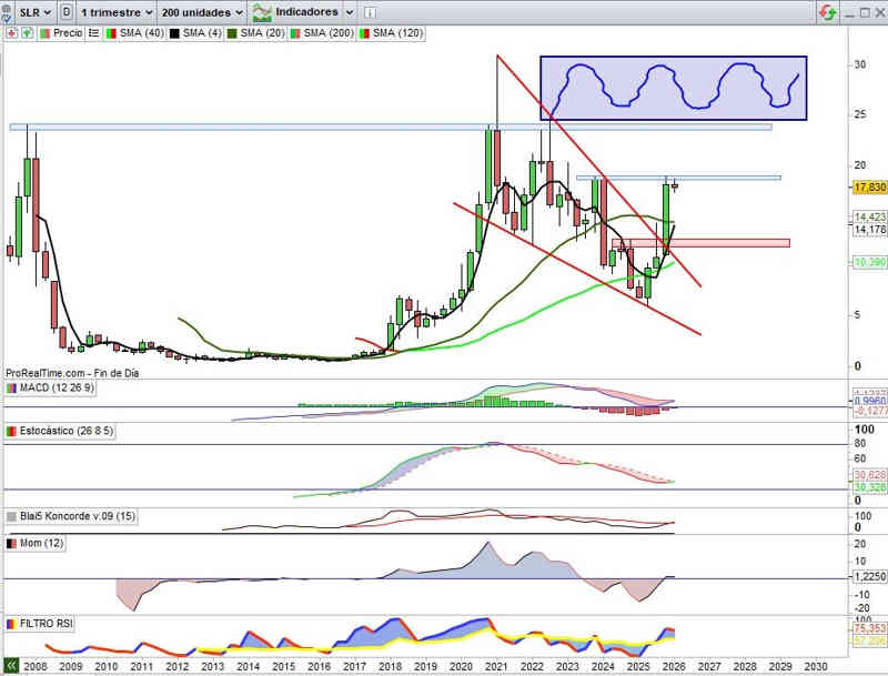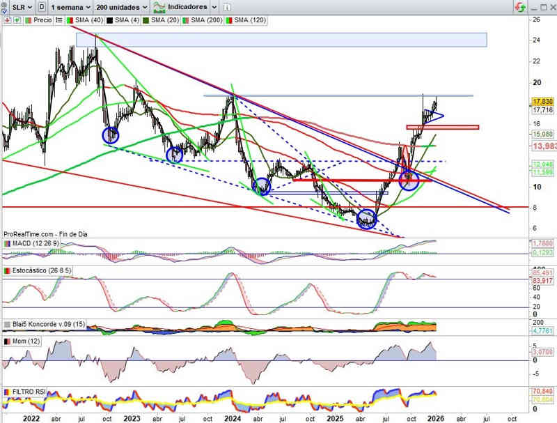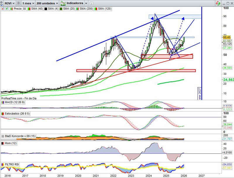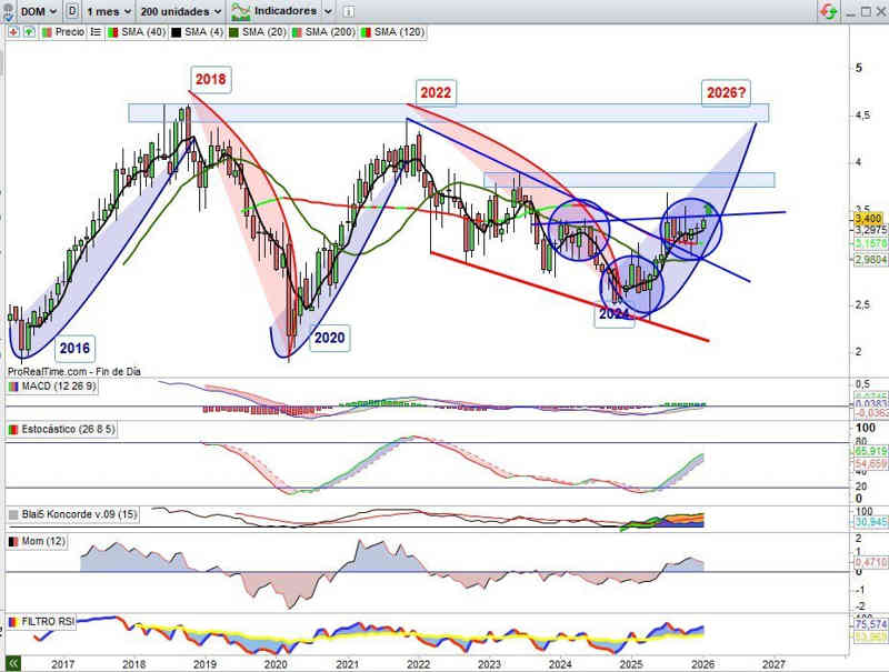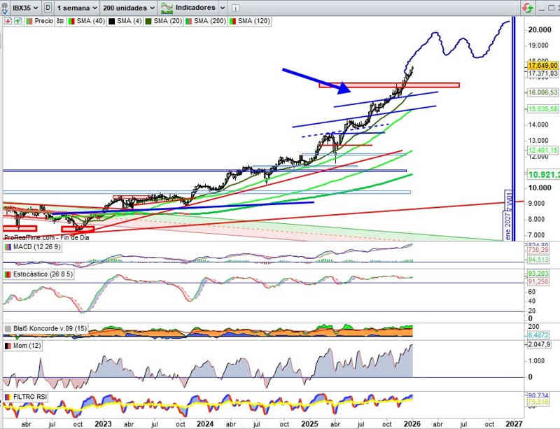Sobre Gráfico Semanal, con indicadores en absoluta señal de compra y en favor de la tendencia. Mantenemos el boceto técnico de desarrollo del ejercicio del 2026 de momento. No hay cambios en lo que se refiere al soporte inmediato.