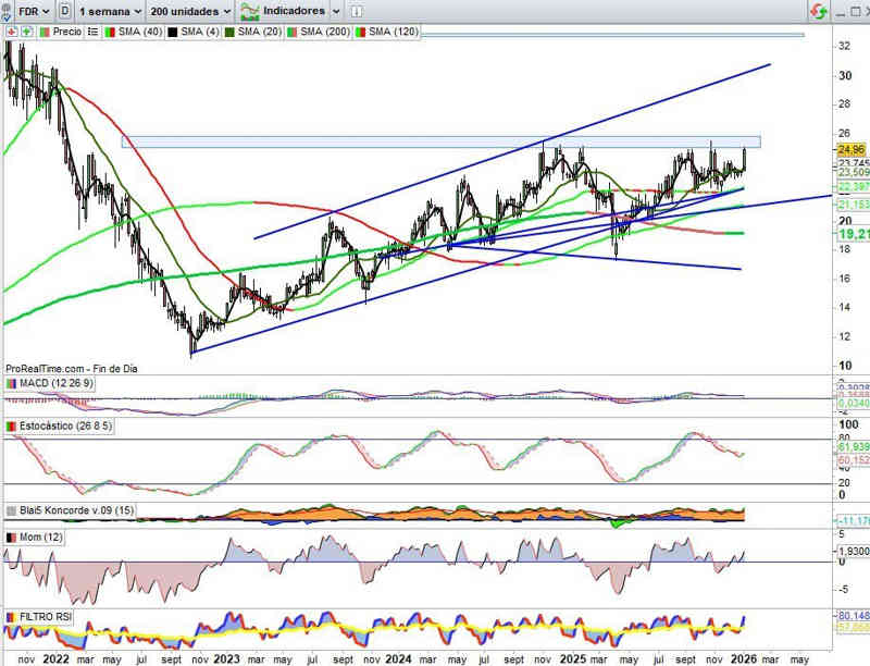 24,96€, +6,21% esta semana. Activo atacando resistencia clave muy importante, porque supone una zona techo muy relevante del lado técnico, en el rango entre los 25€ y 26€ probada en medio plazo hasta en 6 ocasiones con la de esta semana.