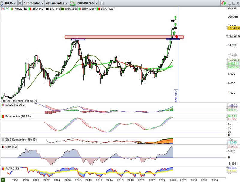 Sobre Gráfico Trimestral, incorporado a finales del ejercicio 2025, impecable señal por tanto para establecer las miras de un IBEX35 en gran fuerza inversora. Esta vista Gráfica que también incorporamos en muchos activos en cartera en impecable señal de tendencia es significativamente relevante para establecer las miras del principal índice de referencia de mercados españoles.
