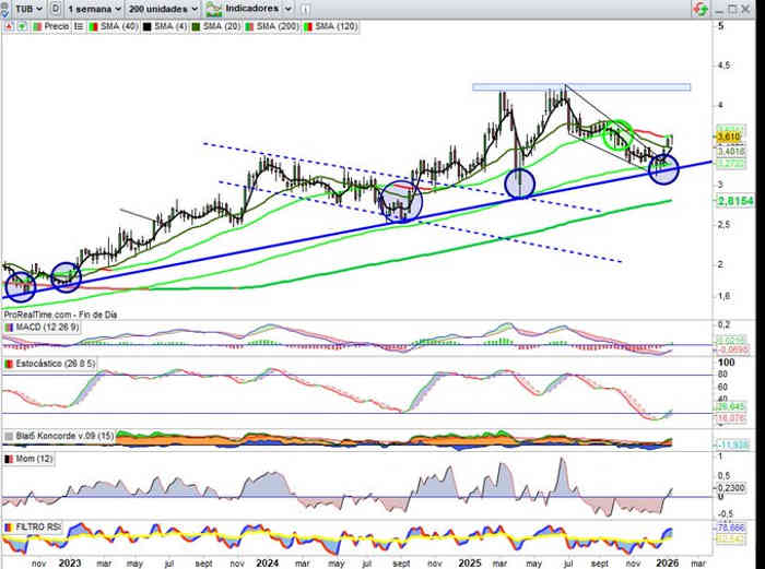 Sobre Gráfico Semanal, la rotura de la Cuña Bajista de Implicaciones alcistas rompiendo resistencia justo sobre la directriz alcista de largo plazo del valor, activa capital comprador para un movimiento de relanzamiento alcista estructural con primer objetivo en los máximos recientes de la estructura en desarrollo, zona 4,27€; un único obstáculo ya en el camino, la Media Móvil 40, ahora en 3,63€. Indicadores en favor de la tendencia, y la señal compra cruzando ya señalando a posible confirmación de corto plazo. Recordando, a Gran Cuña de Implicaciones Alcistas confirmada en perforación de resistencia, alta probabilidad de Gran proyección en connotación de tendencia, Alcista.