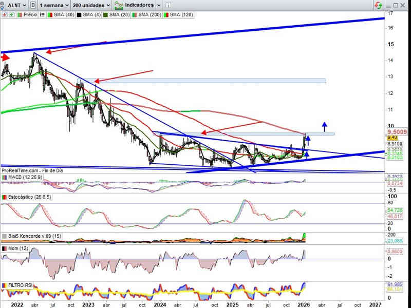 De momento apoyando donde tiene que hacerlo para dar continuidad a la estructura que trajo el valor a probar la resistencia clave en estos momentos, la zona de los 9,50€, y con todo armado del lado de los indicadores para perforarla, vamos a ver si lo consigue antes de que comunique resultados del ejercicio 2025, que van a ser muy buenos, y expectativas 2026, mejores.