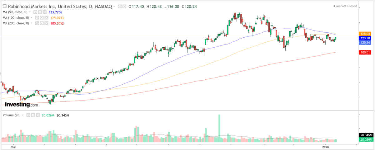 Su próximo informe de resultados, previsto para el 10 de febrero, podría volver a superar las expectativas, como ha ocurrido en los últimos trimestres, gracias a los volúmenes de negociación récord y al crecimiento del número de usuarios. Se prevé que Robinhood gane 0,60 dólares por acción, lo que supone un aumento interanual del 51,1%. Se prevé que los ingresos aumenten un 31,7%, hasta alcanzar los 1.330 millones de dólares.