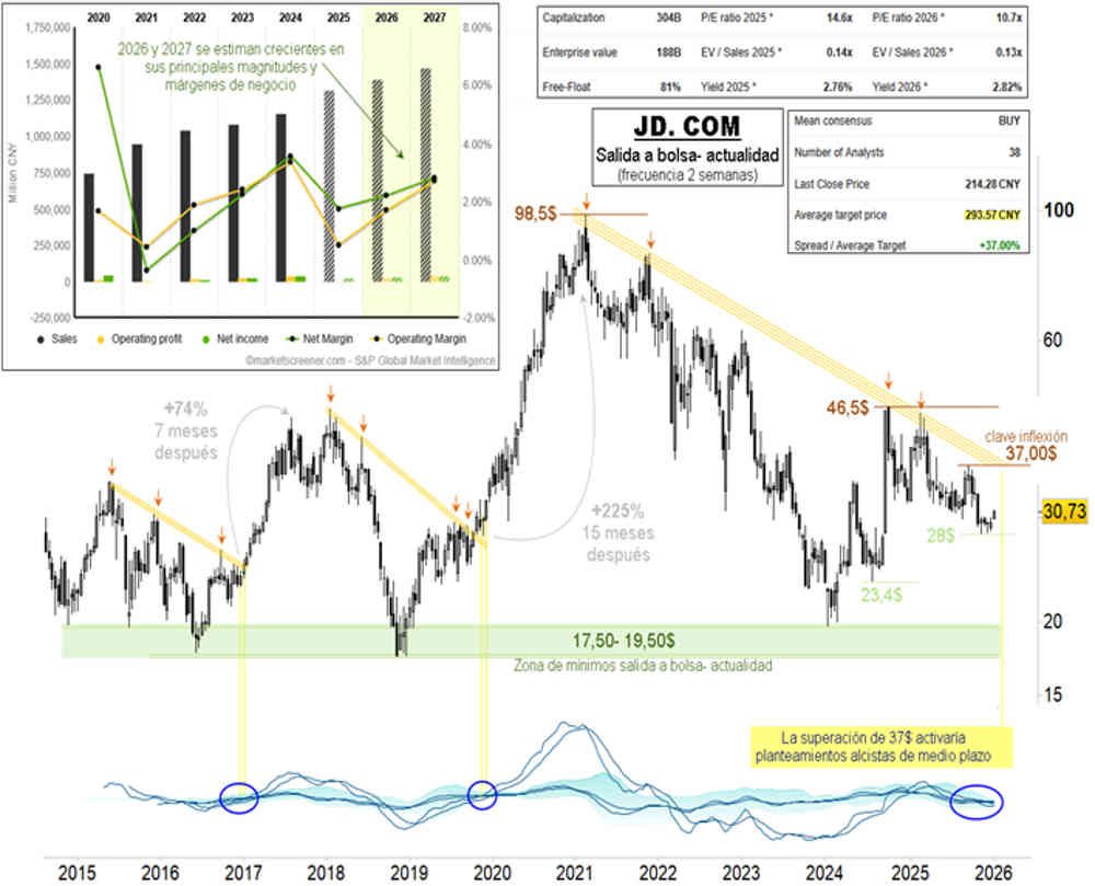 La china de comercio electrónico JD.COM mantiene desde el año 2021 una tendencia bajista, cuya directriz marca, a su paso en 37 dólares, un punto clave de inflexión para hablar de un cambio de tendencia.