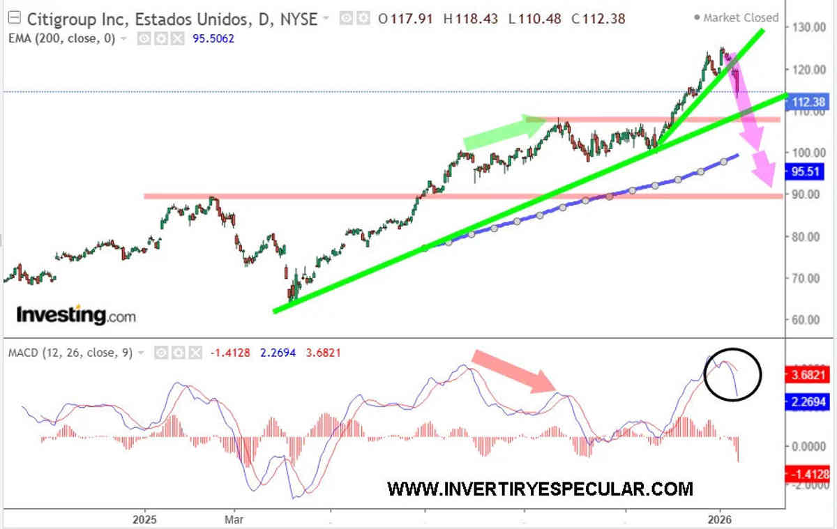 El castigo fue inapelable para Citigroup, un 3.38% a la baja. Otra firma financiera que pierde momento e irá a por máximos rotos anteriores, EMA 200 e incluso si hay corrección generalizada a 90 primeros máximos del año pasado.