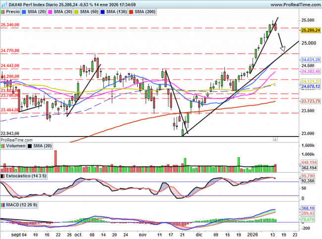 • DAX: Por debajo del nivel clave de los 25340 puntos 15 enero 2026