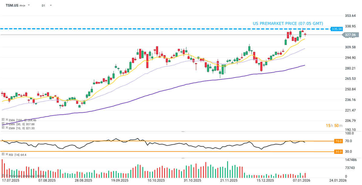 Las acciones de TSMC subieron aproximadamente un 2,5% en las operaciones previas a la apertura del mercado en Wall Street, a pesar de que el RSI diario rondaba niveles de sobrecompra.