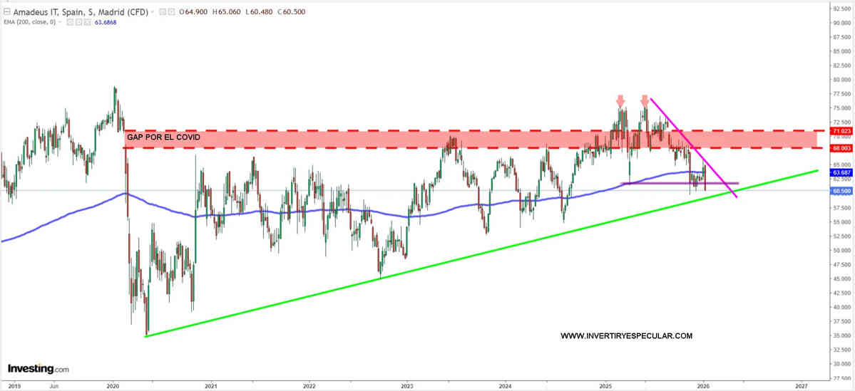 Mientras el mercado hace nuevos techos Amadeus se acerca a la alcista de mínimos del 2020 perforando incluso la EMA 200 semanal dejando tras de si como gran hito en este último sexenio casi haber tapado el gap generado por el covid, pero tras superarlo marcó un doble top en el primer semestre del año pasado y de ahí para abajo, tanto ha bajado que también ha perdido los mínimos de abril pasado y lo peor es que lo ha hecho otras veces en gráfico semanal.