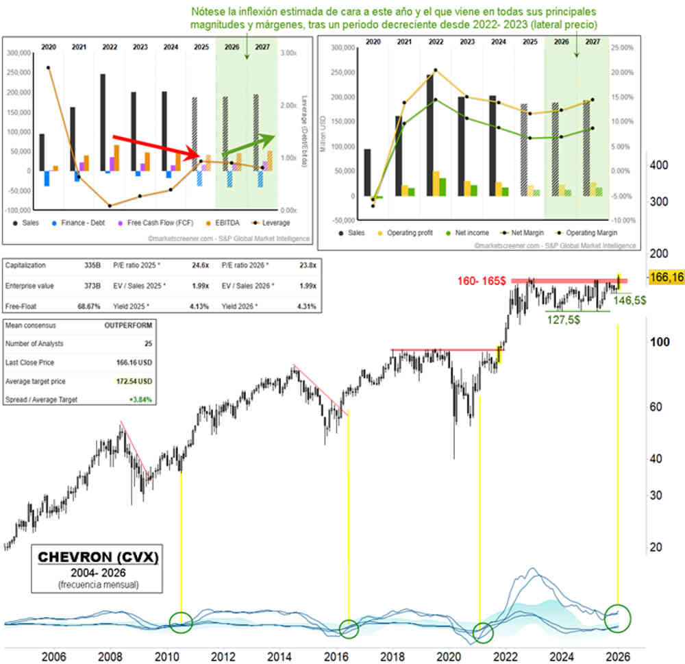 El caso de CHEVRON (CVX) es más palmario, ya que viene superando durante el mes de enero una importante franja de resistencia desde mayo de 2022 (nada menos que 43 meses). La superación casualmente coincide con la inflexión al alza en los crecimientos de sus principales magnitudes y márgenes proyectadas para este año y el que viene, tras años de decrecimiento desde 2022-2023 (coincidiendo con el proceso lateral del precio).