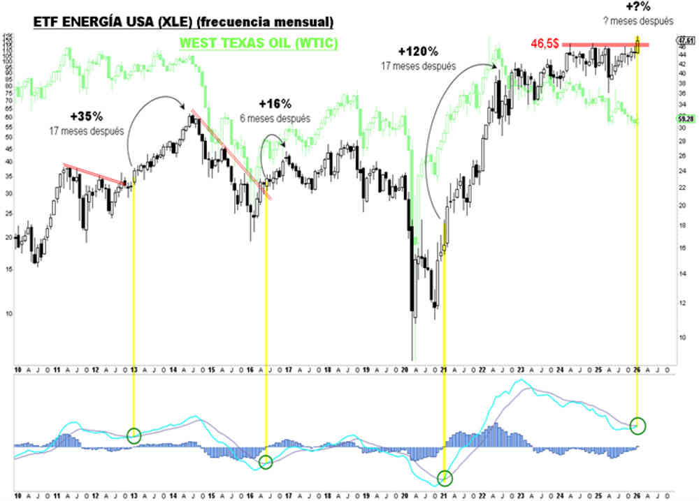Como podemos comprobar en el gráfico superior, la superación durante este mes de enero de la zona de máximos de los últimos 18 meses (abril 2024) en 46,5 dólares representa un hito táctico, que, a la luz de sus indicadores técnicos lentos, favorece una continuidad durante los próximos meses. Este dato también sería clave para el petróleo, ya que generalmente presenta una elevada correlación con la evolución del sectorial.