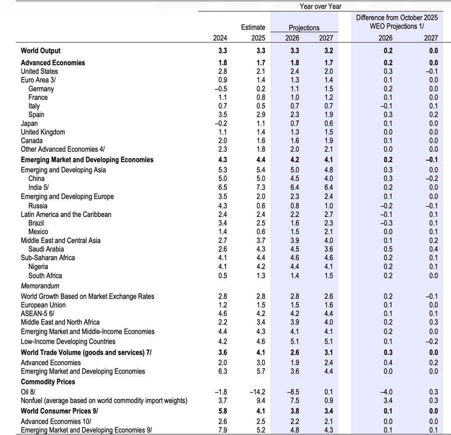 El FMI proyecta un crecimiento del +3.3% del PIB mundial, dos décimas por encima de las estimaciones de octubre debido principalmente al impulso esperado de la inversión en inteligencia artificial.