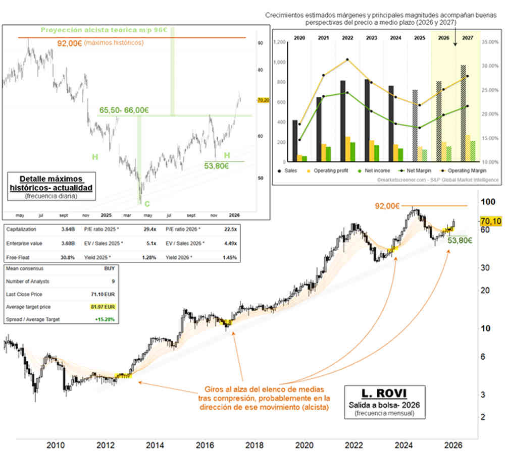 Rovi (ROV:MC), tras romper la tendencia bajista desde los máximos históricos de 2024, también ha traspasado la zona de 65,50- 66 euros, donde presentaba una resistencia intermedia, ahora soporte inmediato, previo a los mínimos del pasado noviembre, en 53,80 euros.