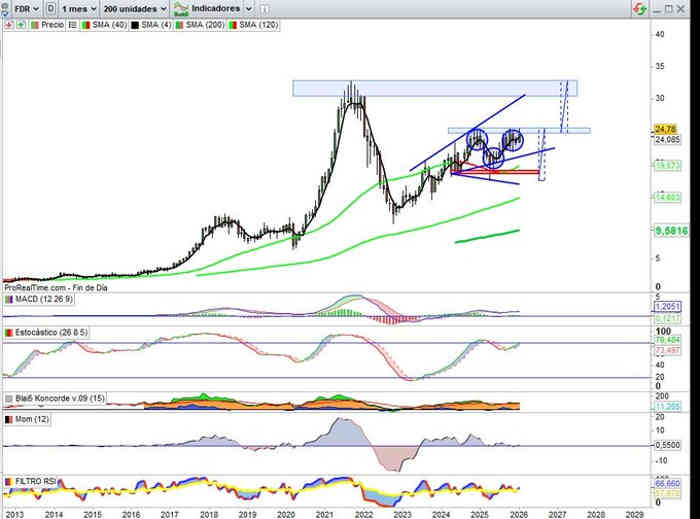 En su estrecha relación amor / odio con la resistencia clave de la zona 25€ / 25,60€, en desarrollo Hombro Cabeza Hombro Invertido, de cara a cierre de próximos meses, sería técnicamente viable en actuales credenciales técnico / fundamentales que terminase por perforarla y proyectarse hacia sus máximos históricos en evolución del Campo Expansivo comentado en anteriores actualizaciones.