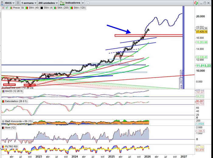 Si el mercado arroja dudas en este momento en territorio nacional y por tanto sobre los activos de los mercados españoles o a nivel Europa, este es el momento, si consideramos la fase consolidación habitualmente necesaria tras subidas muy pronunciadas y en el escenario planteado a inicio de ejercicio, Alcista / Lateral / Alcista, porque cuanto antes ocurra un retroceso consolidativo a nivel técnico en lo que se refiere a soportes, más relevante del lado alcista será el mercado español de cara a desarrollo del ejercicio 2026 en próximas semanas, meses.